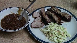PorkTenderloins and Spare Ribs, Tried some new rubs on some ribs and tenderloins on the weber with some baked beans and homemade coleslaw.Sorry about the horrible chewing noises on the loins lol didnt notice that until after upload.
